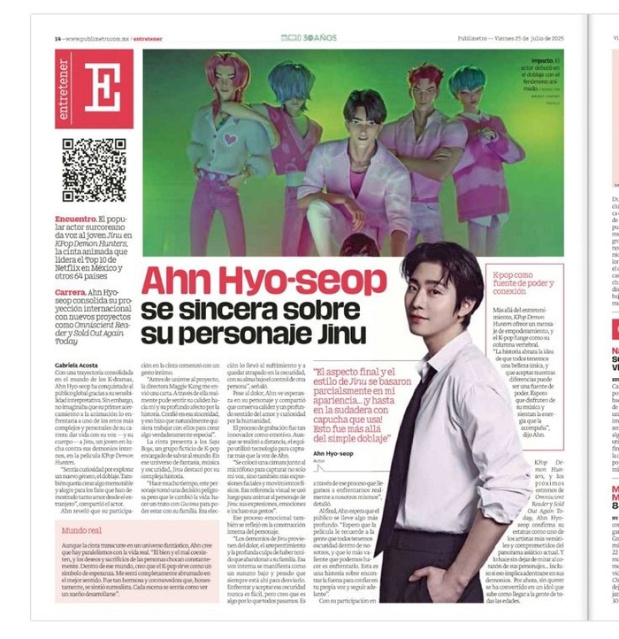 이처럼 애니메이션과 영화에서 잇따라 주연으로 활약한 안효섭의 행보는 해외 언론의 주목을 받고 있다. 특히 멕시코의 유력 대중지 El Metro는 안효섭을 1면 커버로 다루며, K-드라마에서의 활약부터 애니메이션 보이스 연기, 실사 영화까지 그의 다채로운 커리어를 집중 조명했다.