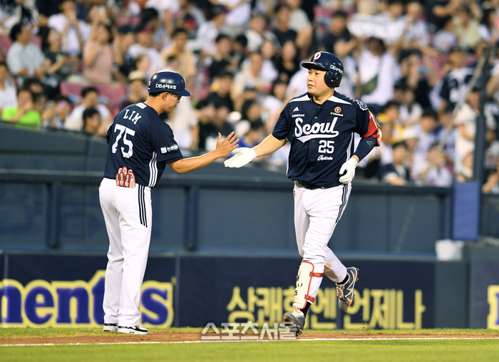 두산 양의지(오른쪽)가 5일 잠실구장에서 열린 2025 KBO리그 LG와의 경기 4회초 무사 LG 선발 손주영을 상대로 솔로 홈런을 친 뒤 임재현 코치와 하이파이브를 하고 있다. 양의지의 시즌 16호 홈런. 2025. 8. 5.