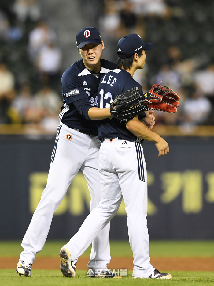 두산 선발투수 최승용(왼쪽)이 5일 잠실구장에서 열린 2025 KBO리그 LG와의 경기 5회말 무사 자신을 맞고 굴절된 LG 문보경의 타구를 처리한 유격수 이유찬을 껴안고 있다. 2025. 8. 5.