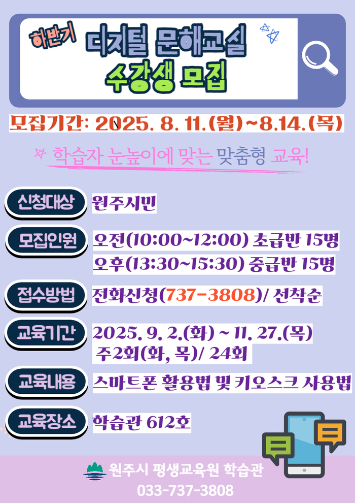 [스포츠서울ㅣ원주=김기원기자]원주시 평생교육원 학습관(관장 윤석재)은 8월 11일(월)부터 14일(목)까지 하반기 디지털 문해교육 수강생을 모집한다.