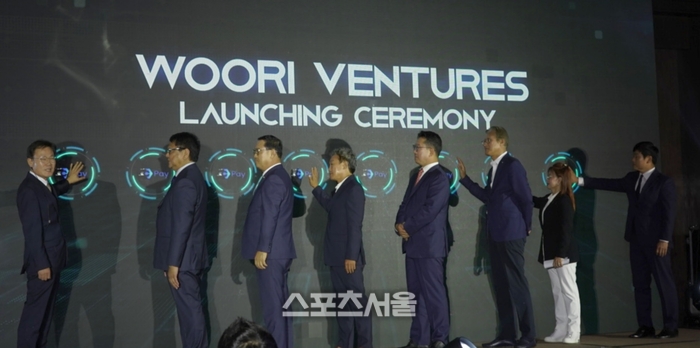 우리벤처스그룹 런칭 행사에서 김병민 법인장(왼쪽 첫번째)과 초청 VIP 7명이 터치스크린을 통한 개회 선언을 진행하고 있다.