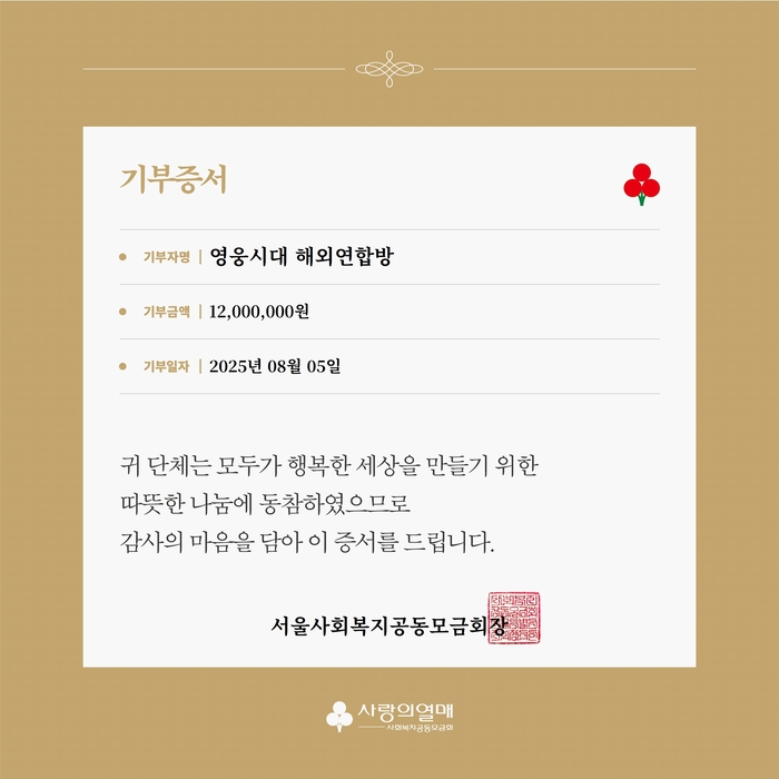 태국, 인도네시아, 필리핀, 중국, 홍콩, 호주, 미국, 캐나다, 아르헨티나, 독일 등 10여 개국에서 모인 61명의 ‘영웅시대 해외연합방’은 사랑의열매를 통해 1,200만 원의 성금을 기부했다.