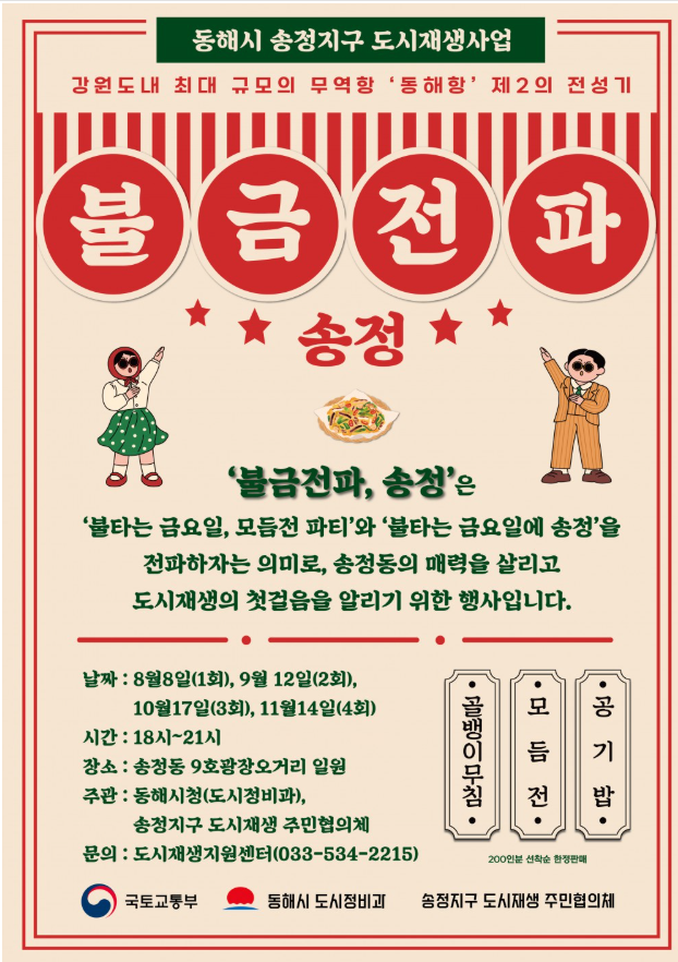 ‘불금전파, 송정’은 ‘불타는 금요일, 모듬전 파티’의 약칭으로, 송정동의 불금을 전파하고 지역에 활력을 불어 넣는다는 중의적 의미를 내포하고 있다. 이번 행사는 동해·묵호항에서 들어오는 신선한 골뱅이를 활용한 골뱅이무침과 송정시장의 제철 식재료로 만든 다채로운 모듬전을 주민협의체가 직접 요리해 선보인다.