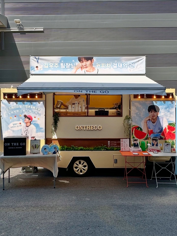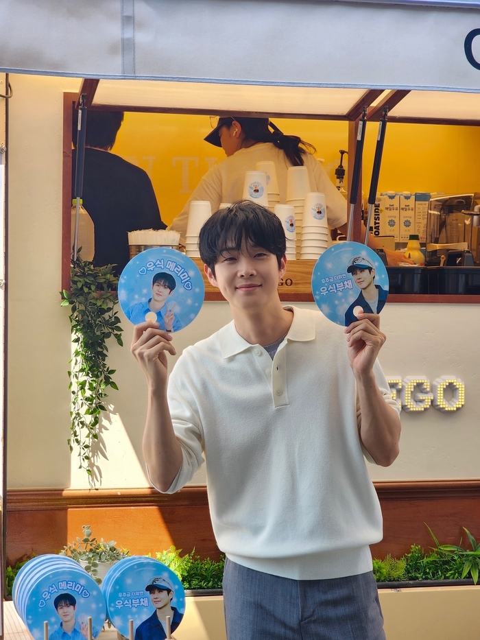 수박차는 ‘김우주 팀장님! 커피차 결제의 건’이라는 센스 있는 문구가 적힌 현수막과 함께, 다양한 배너, 손부채 등 팬들이 준비한 굿즈로 꾸며져 눈길을 끈다. 테이블에는 최우식의 모습이 담긴 팬아트와 사진, 그리고 “우주메리미팀 스탭분&배우분 모두에게 박‘수박’‘수박’수박‘수”라는 유쾌한 메시지가 부착되어 있어 촬영장 분위기를 한층 훈훈하게 만들었다.