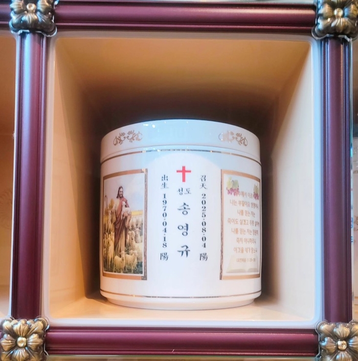 사진 속에는 고 송영규의 유골함이 놓여 있다. 김진수가 직접 납골당을 찾아 마지막 인사를 건넨 것으로 보인다.