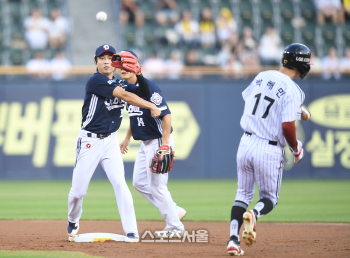 LG 박해민이 6일 서울 잠실구장에서 열린 2025 KBO리그 두산과 경기 3회말 1사1루 신민재 내야땅볼 때 2루에서 포스아웃되고 있다. 상대 유격수는 이유찬.