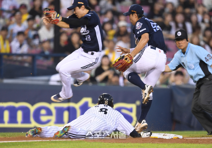 LG 문성주가 6일 서울 잠실구장에서 열린 2025 KBO리그 두산과 경기 4회말 무사2,3루 문보경 내야땅볼 때 3루로 귀루하고 있다. 상대는 박준순과 이유찬.