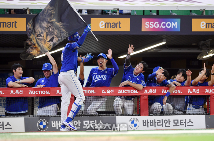 삼성 디아즈가 6일 인천 SSG랜더스필드에서 열린 2025 KBO리그 SSG와의 경기 6회초 1사 SSG 선발 앤더슨을 상대로 솔로 홈런을 치 뒤 사자가 그려진 깃발을 들고 동료들과 하이파이브를 하고 있다. 디아즈의 두 경기 연속 홈런으로 시즌 35호 홈런. 2025. 8. 6.