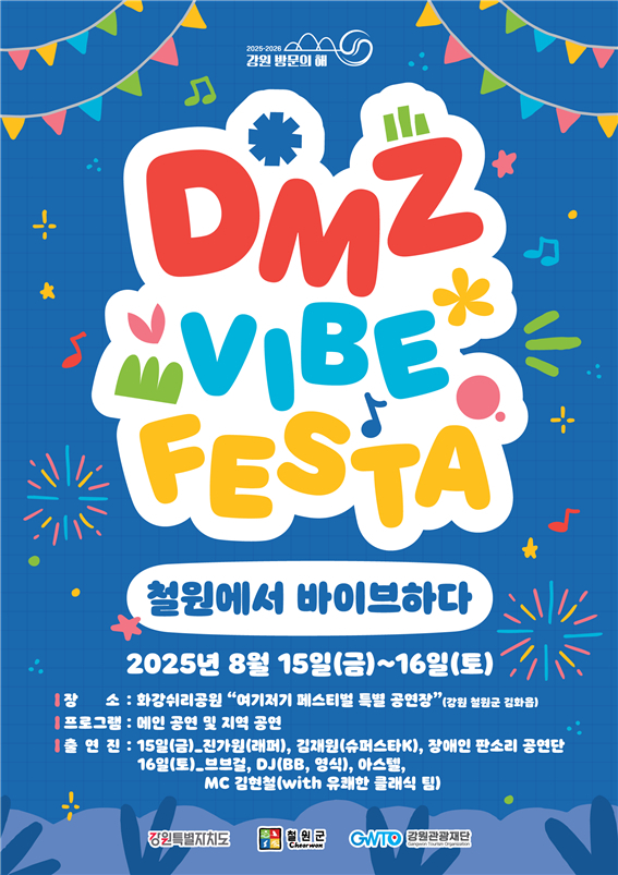 ‘2025-2026 강원 방문의 해’ 특별 기획으로, 국내 유일의 접경지역 음악 축제 ‘DMZ 바이브 페스타(VIBE FESTA)’가 첫선을 보인다. 70년 분단의 상징 DMZ를 젊은 세대를 위한 ‘감성 여행지’로 만들기 위해 강원특별자치도와 철원·화천·양구·인제 4개군, 강원관광재단이 뜻을 모았다. 그 첫 무대는 8월 15~16일, 철원 화강의 ‘여기저기 페스티벌’ 특별 공연장에서 열린다.