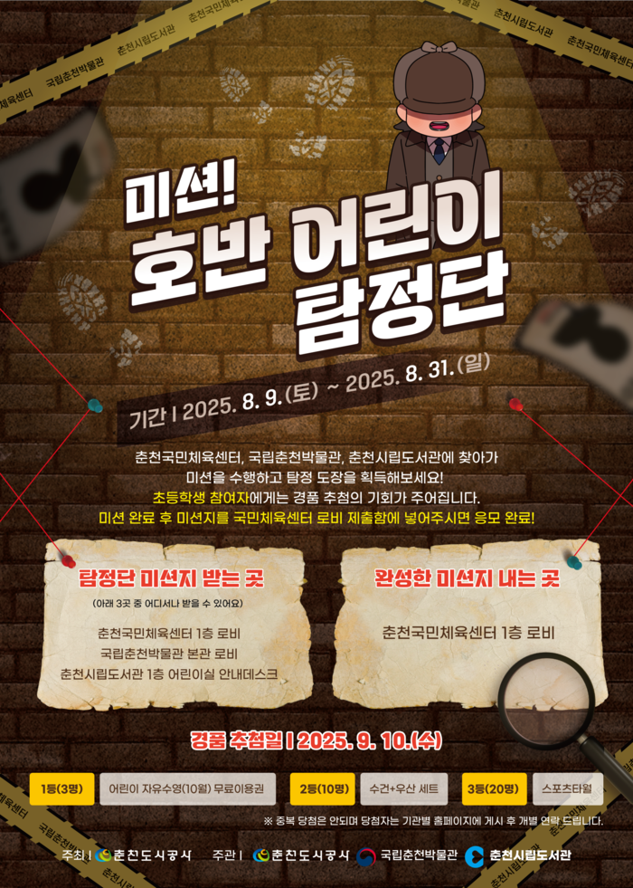 참여를 원하는 어린이는 춘천국민체육센터, 국립춘천박물관, 춘천시립도서관 중 한 곳을 방문하여 미션용지를 수령한 뒤, 각 기관에 마련된 탐정 미션을 수행하며 도장을 획득할 수 있다.