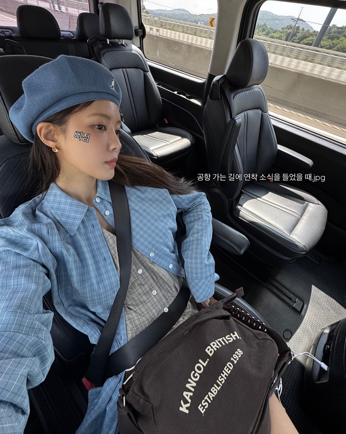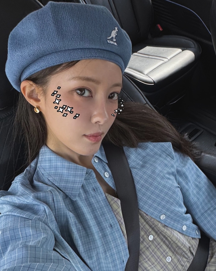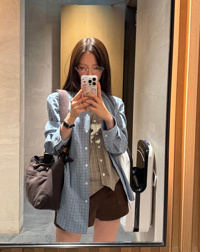 공개된 사진 속 효민은 은은한 하늘색 체크 셔츠와 브라운계열의 반바지, 그리고 체크 패턴의 베스트를 매치하여 심플하면서도 세련된 캐주얼룩을 완성했다.