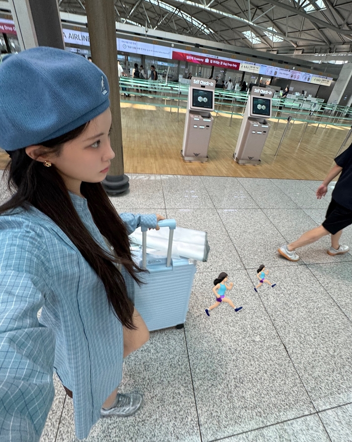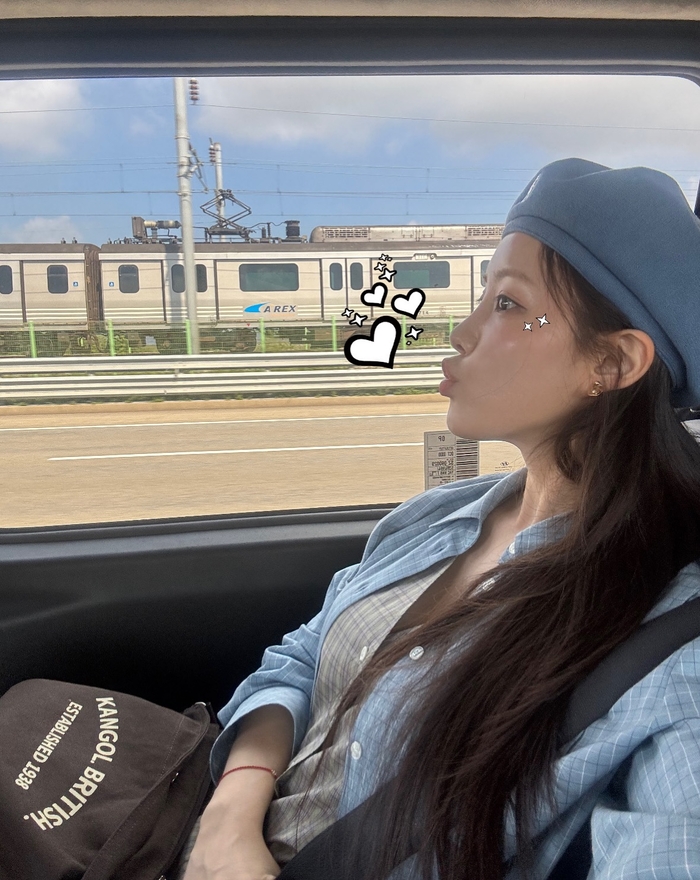 효민은 귀여운 블루 컬러의 버킷햇을 착용하고, 베이지색 이어링과 블랙 워치 등 액세서리로 포인트를 더했다.