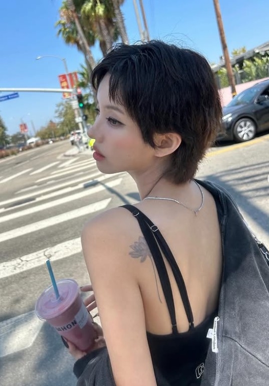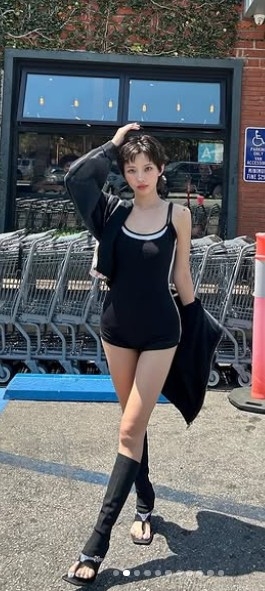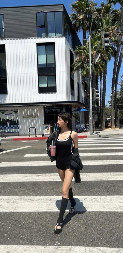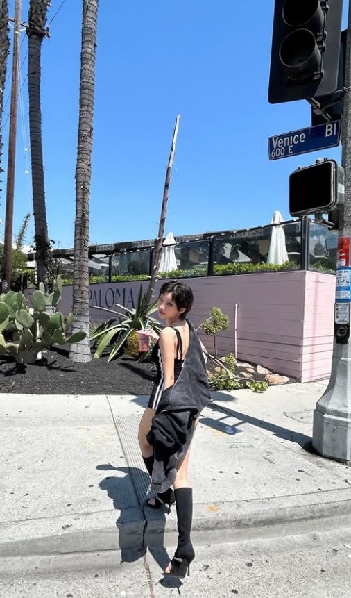 공개된 사진 속 그는 블랙 톤의 보디슈트를 입은 채 LA 거리를 여유롭게 걷고 있는 모습. 길게 뻗은 각선미, 어깨 너머로 살짝 보이는 타투, 과감한 컷의 의상이 푸른 하늘과 어우러져 눈길을 사로잡는다.