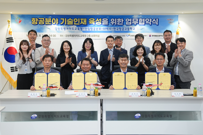 [스포츠서울ㅣ춘천=김기원기자]강원특별자치도교육청(교육감 신경호), 산림항공본부(본부장 김만주), 태백시(시장 이상호), 한국항공고(교장 문명호)는 7일(목) 강원특별자치도교육청에서 항공분야 기술인재 육성을 위한 업무협약을 체결했다.