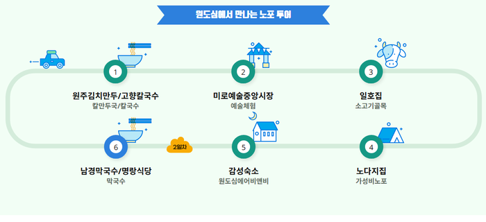 서부지역의 소금산그랜드밸리와 동부지역의 반곡~금대 활성화 사업을 메인관광으로 원도심의 강원감영, 박경리문학공원, 전통시장, 노포맛집, 야시장 등을 묶어서 꽉찬 프로그램을 준비하고 있다.