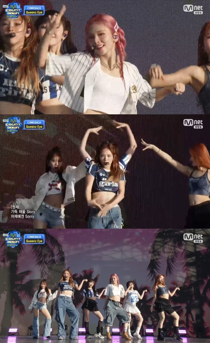 이날 방송에서 퀸즈아이는 상큼한 비주얼과 함께 무대에 등장, 통통 튀는 사운드와 유쾌한 퍼포먼스로 시선을 단숨에 사로잡았다. 찌는 듯한 더위를 잊게 만드는 청량한 분위기 속, 여섯 멤버들은 긴장감 없이 유려한 춤선과 러블리한 눈웃음으로 무대를 가득 채웠다.