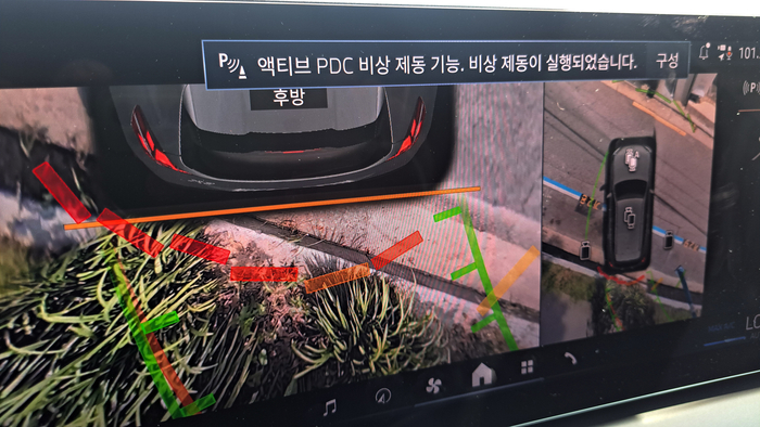 주차 중 장애물이 감지되면, 브레이크를 밟지 않아도 차량이 스스로 멈춘다. 일부러 가속페달을 밟았지만 꿈쩍도 하지 않는다.