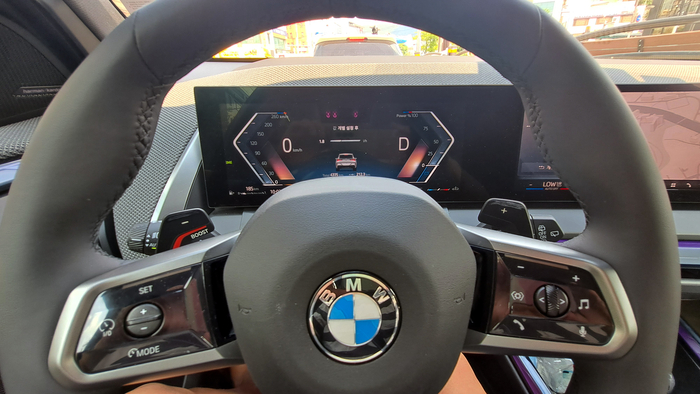 12.3인치 계기판과 14.9인치 인포테인먼트 화면이 일체형으로 연결돼 있고, 하단엔 ‘BMW 인터랙션 스마트 바’가 자리잡았다. 주행 중 조작은 직관적이고, 간결한 센터페시아 구성은 실내 분위기를 더 깔끔하게 만든다. 핸들은 두툼한 편이다.