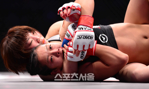 [스포츠서울] 로드FC 020 아톰급에서 송가연이 사토미에게 공격을 당하고 있다. 이주상 선임기자. rainbow@sportsseoul.com