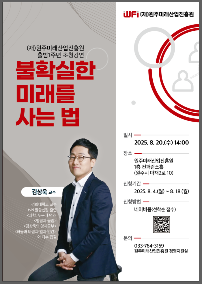 [스포츠서울ㅣ원주=김기원기자](재)원주미래산업진흥원(원장: 조영희)은 출범 1주년을 기념하여 오는 2025년 8월 20일(수) 오후 2시, 진흥원 1층 컨퍼런스홀에서 김상욱 경희대학교 교수를 초청해 특별강연을 개최한다고 밝혔다.