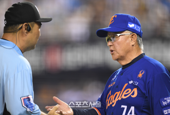 한화 김경문 감독이 8일 서울 잠실구장에서 열린 2025 KBO리그 LG와 경기 7회말 2사1,3루 문보경 타석 때 3루심에 항의를하고 있다.