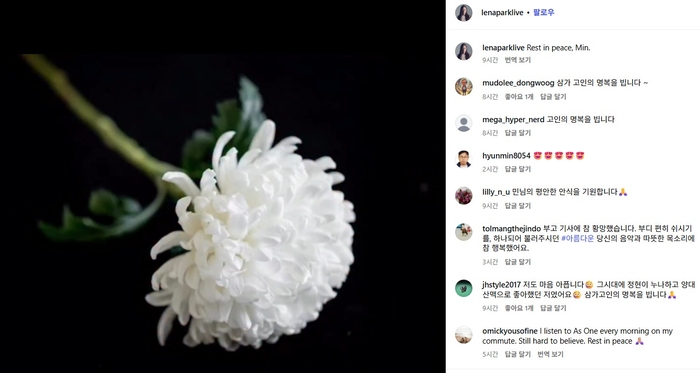 박정현은 9일 자신의 인스타그램에 국화꽃 사진과 함께 “Rest in peace, Min(편히 잠들길, 민)”이라는 글을 남겼다. 짧지만 깊은 애도 메시지에 고인을 향한 그리움과 안타까움이 담겨있다.