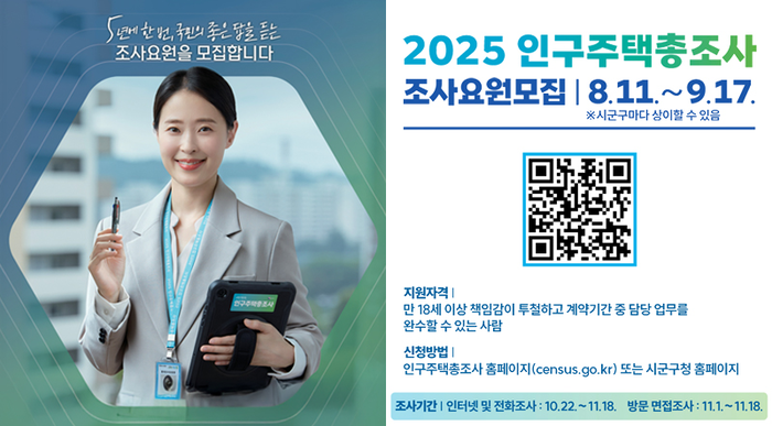 김두기 기획예산과장은 “정확한 인구주택총조사 결과는 향후 각종 국가 정책과 지역 발전의 기초자료로 활용되는 만큼 현장 조사요원의 역할이 매우 중요하다”라며 “책임감 있고 성실한 인재의 적극적인 지원을 기대한다”고 밝혔다.