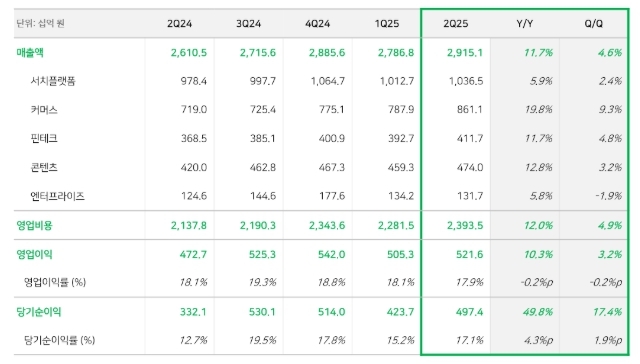 [스포츠서울 | 표권향 기자] 네이버㈜가 올해 2분기 매출액 2조9151억 원, 영업이익 5216억 원, 당기순이익 4974억 원을 기록했다고 밝혔다.