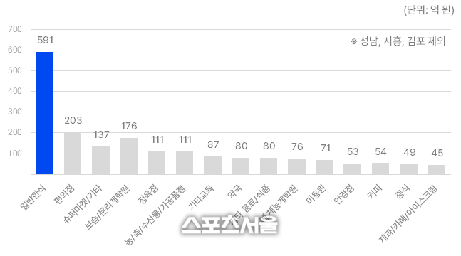 음식점에 이어 사용 비중이 높았던 업종은 편의점과 슈퍼 등 일반 소매점(15.2%)이다. 편의점은 203억 원(8.11%), 슈퍼마켓 등에서 176억 원(7.05%)이 각각 사용됐고, 그 뒤를 이어 교육 및 학원 분야에서 13.4%, 정육점을 비롯한 농축 수산물 업종에서 9.2%, 커피‧음료‧제과 등 디저트 업종에 7%가 각각 사용됐다.
