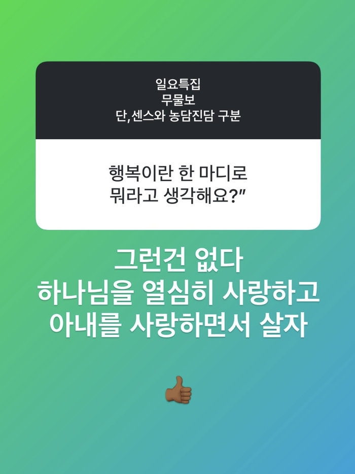 진태현은 “행복이란 한마디로 뭐라고 생각하냐”는 질문에는 “그런 건 없다”며 “하나님을 열심히 사랑하고 아내를 사랑하면서 살자”며 아내에 대한 사랑을 강조했다.