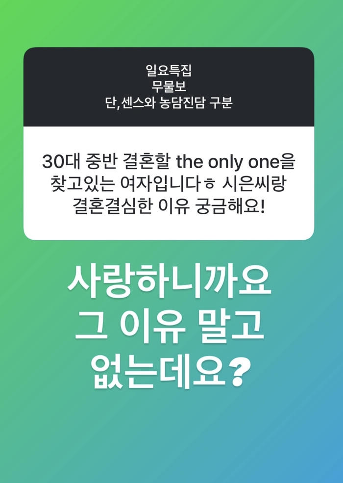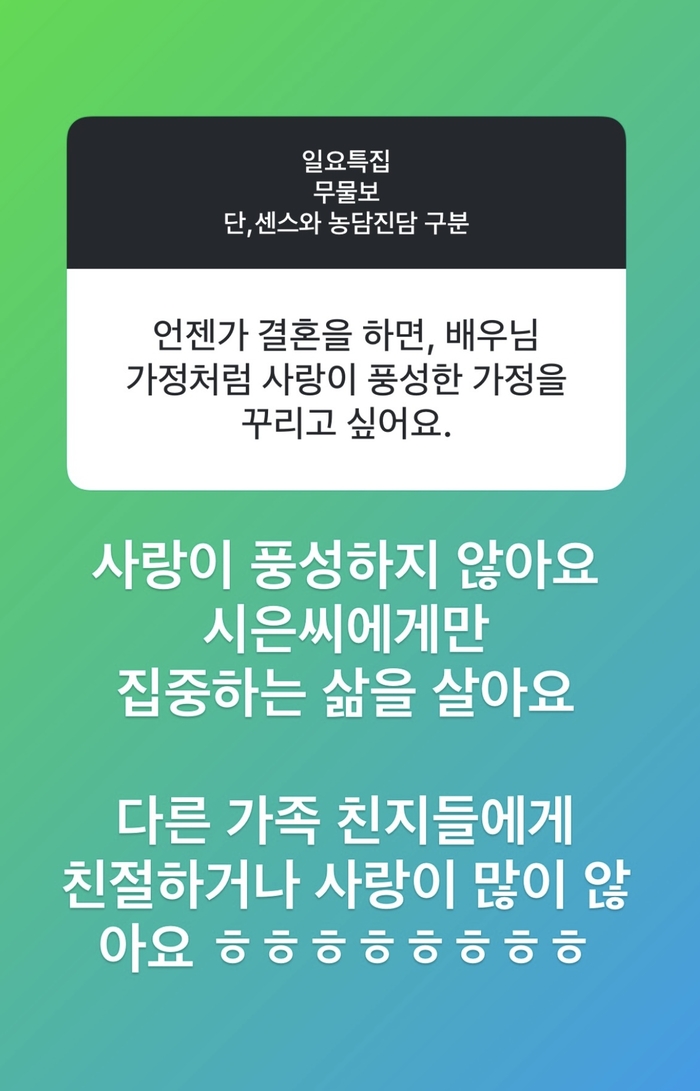 이어 “언젠가 결혼을 하면 배우님 가정처럼 사랑이 풍성한 가정을 꾸리고 싶다”는 누리꾼에겐 “사랑이 풍성하지 않다”면서도 대신 “시은씨에게만 집중하는 삶을 산다”고 설명했다.