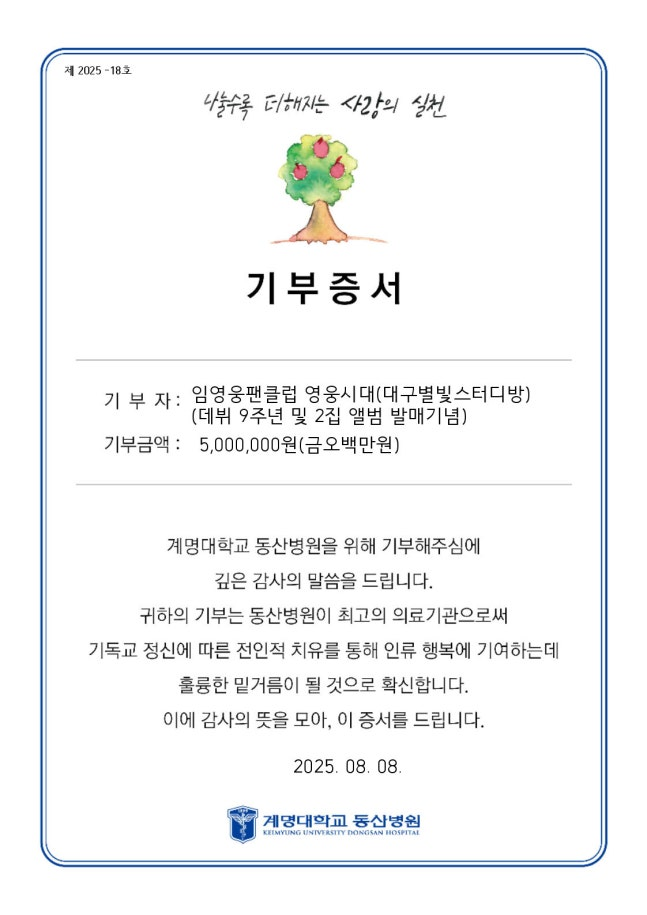 계명대학교 동산병원 사회복지팀은 “영웅시대 대구별빛스터디방의 기부에 감사한 마음이다”라며 “임영웅과 임영웅 팬클럽 모두 건강하길 바라며 사랑, 나눔의 실천에 감사드린다”고 전했다.
