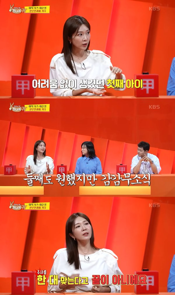 이날 방송에서 이정민은 이순실의 VCR을 보던 중 나민희의 시험관 시술 경험에 깊이 공감했다. 그는 “저 같은 경우에도 첫째는 결혼하고 자연스럽게 바로 생겼는데, 둘째를 가져야지 했더니 안 생기는 거예요. 그래서 병원에 갔더니 이제는 시험관을 해야 될 타이밍이다. 이런 판정을 받아서 시험관을 시도했는데, 주사를 한 대 맞는다고 끝이 아니에요. 시간을 맞춰서 그 시간에 그 주사를 맞아야 하는데, 하루에 서너 번씩 맞아요.”이라며 “그게 또, 시간 타임을 놓치면 그 한번에 사이클이 망쳐지는 거예요. 그래서 회식을 하다가 알람이 울리면 화장실에 가요. 주사를 몰래 챙겨서 주사를 맞은 적이 있었어요.”라고 고백했다.