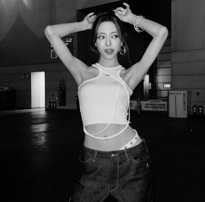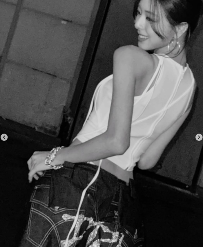 공개된 사진 속 유나는 골반 라인을 살짝 노출한 로우라이즈 팬츠에 절개가 들어간 톱 의상을 입고 포즈를 취했다.