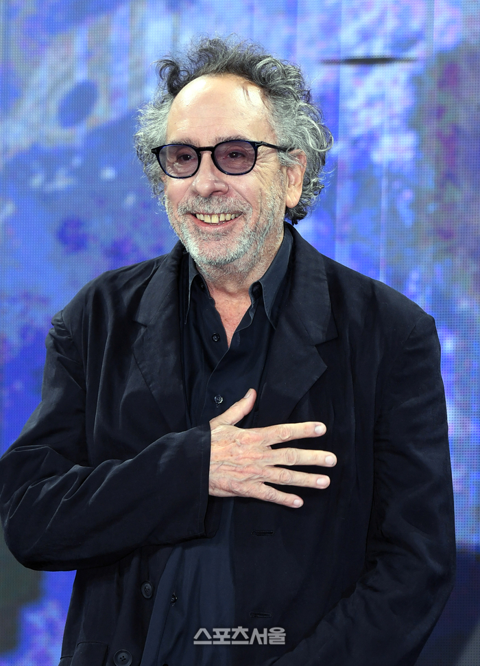 팀 버튼 감독이 11일 서울 종로구 포시즌스호텔에서 진행된 넷플릭스 시리즈 ‘웬즈데이 시즌2’ 기자간담회에서 취재진을 향해 포즈를 취하고 있다. 2025. 8. 11.