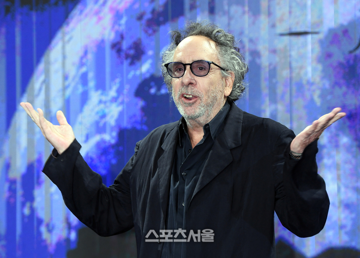 팀 버튼 감독이 11일 서울 종로구 포시즌스호텔에서 진행된 넷플릭스 시리즈 ‘웬즈데이 시즌2’ 기자간담회에서 취재진을 향해 포즈를 취하고 있다. 2025. 8. 11.