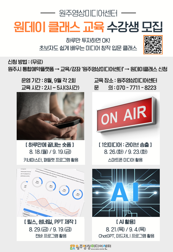 이번 클래스는 8월과 9월에 각 2회씩 총 8회에 걸쳐 탄력적으로 운영된다. 각 클래스는 3시간 과정으로 미디어 콘텐츠 제작에 관심있는 원주 시민이라면 누구나 무료로 참여 가능하다.
