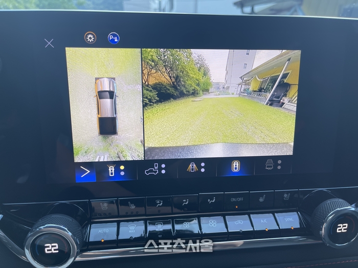 실내를 보자. 센터패시아의 물리적 버튼은 직관적이다. 애플 카플레이 등도 제공되기에 스마트폰과 연동해서 쓰기에도 부담이 없다. 인포테인먼트 홈 화면에서 다양한 화면이 제공된다. 카메라 앱 바로 가기를 누르면, 외부 카메라로 전후좌우 다양한 화면이 제공된다. 이는 험지에서 무리하지 않고 주행할 수 있게 도움을 준다. 중력가속도(G)를 통해 종방향 및 횡방향 가속도 값과 최대 가속도 값을 표시하는 것은 물론 조향각도 등도 다양하게 표시된다.