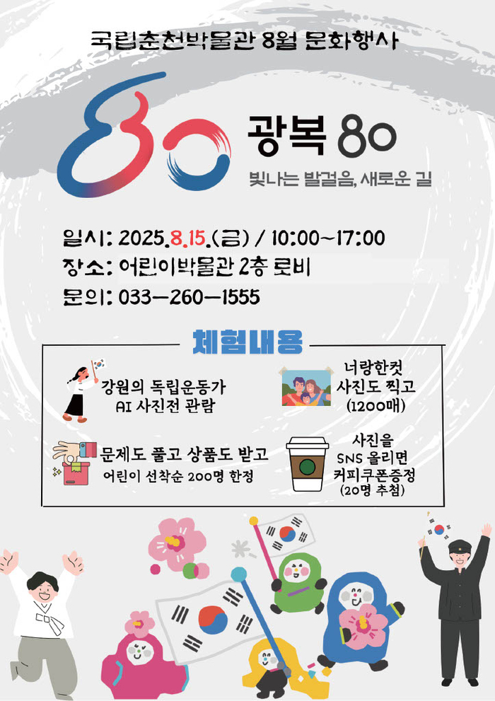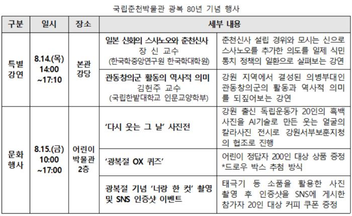 국립춘천박물관 관계자는 “다양한 세대가 참여할 수 있는 특별강연과 문화행사를 개최해 모두가 함께 광복 80주년을 축하하고 의미를 되새길 수 있는 광복절이 되기를 바란다”고 밝혔다.