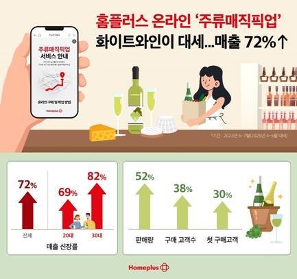 12일 홈플러스가 6~7월 온라인 ‘주류매직픽업’ 서비스 데이터를 분석한 결과, 지난 4~5월 대비 와인 매출 신장률이 위스키보다 크게 늘었다. 특히 화이트와인 매출이 전년 동기 대비 72%, 판매량이 52%, 구매고객수가 38% 증가해 모든 지표에서 뚜렷한 성장세를 보였다. 화이트와인 첫 구매 고객도 30% 증가했다.