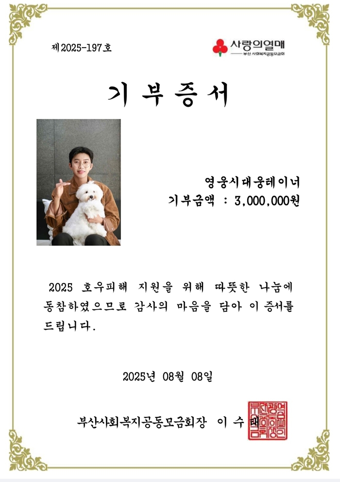 영웅시대 웅테이너는 8일 부산사회복지공동모금회(회장 이수태·부산사랑의열매)에 호우 피해 복구 지원을 위한 성금 300만 원을 전달했다.