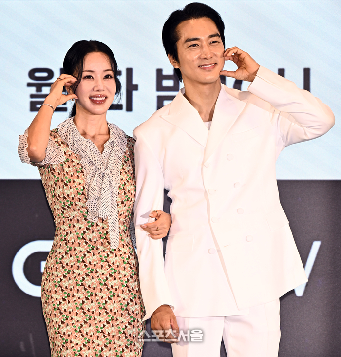 [스포츠서울 글·사진 | 이주상 기자] 배우 엄정화와 송승헌(오른쪽)이 12일 오후 서울 구로구 경인로 신도림 디큐브시티 더 세인트에서 열린 지니 TV ENA 오리지널 ‘금쪽같은 내 스타’(극본 박지하/ 연출 최영훈)의 제작발표회에 참석해 사랑스러운 포즈를 취하고 있다. 두 배우는 포토월에서 현장의 사람들에게 환한 웃음을 짓게 만드는 케미 넘치는 표정과 포즈를 연출해 커다란 호응을 이끌어 냈다.