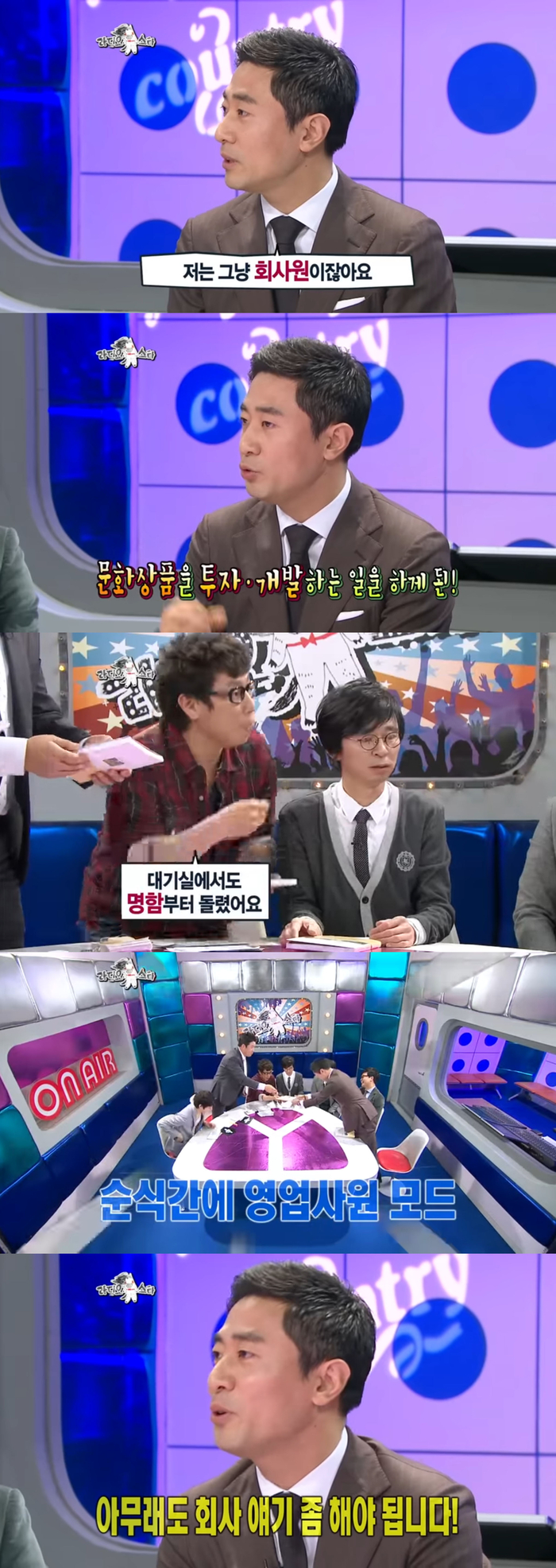 김범수의 모습에 김구라는 “회사에서 압박을 많이 받는 것 같다”고 하자 김범수는 “아무래도 성과를 내야한다”며 홍보성 발언의 이유를 밝혔다.