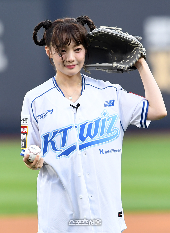 개그우먼 나현영이 12일 수원 KT위즈파크에서 열린 2025 KBO리그 LG와 KT의 경기에 앞서 시구를 하면서 피치컴을 사용하는 시늉을 하고 있다. 2025. 8. 12.