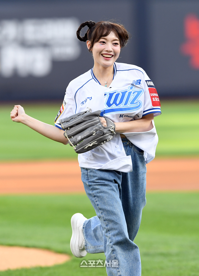 개그우먼 나현영이 12일 수원 KT위즈파크에서 열린 2025 KBO리그 LG와 KT의 경기에 앞서 시구를 한 뒤 포수를 향해 달려가고 있다. 2025. 8. 12.