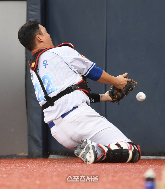 KT 포수 장성우가 12일 수원 KT위즈파크에서 열린 2025 KBO리그 LG와의 경기 3회초 LG 박동원의 파울 탁구를 놓치고 있다. 2025. 8. 12.