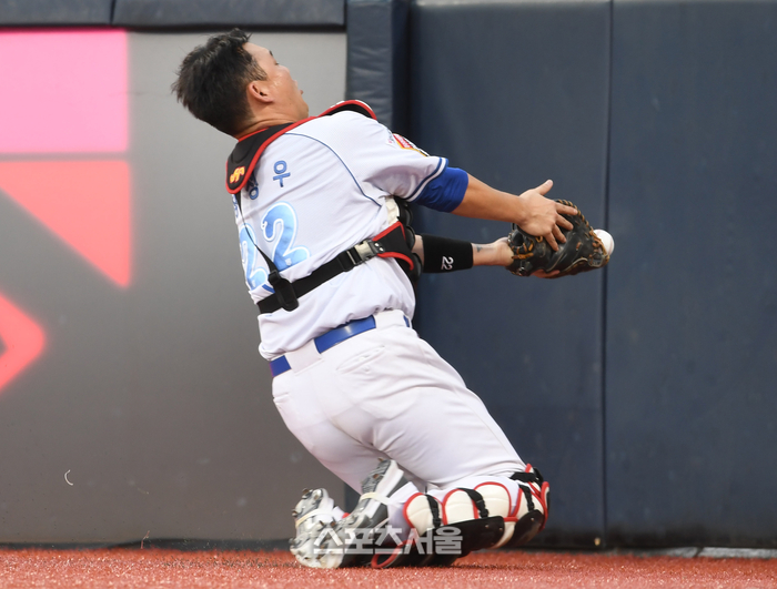 KT 포수 장성우가 12일 수원 KT위즈파크에서 열린 2025 KBO리그 LG와의 경기 3회초 LG 박동원의 파울 탁구를 놓치고 있다. 2025. 8. 12.