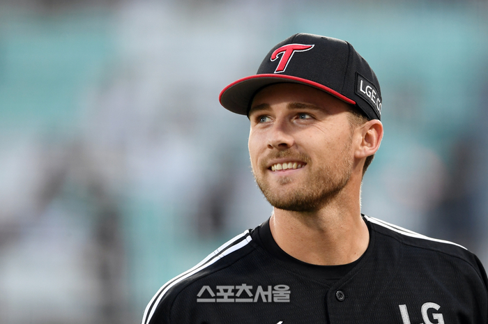 LG 톨허스트가 12일 수원 KT위즈파크에서 열린 2025 KBO리그 KT와의 경기 3회말 1사 1루 상황에서 KT 권동진을 투수 앞 병살타로 처리한 뒤 미소를 지으며 더그아웃으로 향하고 있다. 2025. 8. 12.
