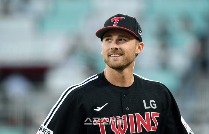 LG 톨허스트가 12일 수원 KT위즈파크에서 열린 2025 KBO리그 KT와의 경기 3회말 1사 1루 상황에서 KT 권동진을 투수 앞 병살타로 처리한 뒤 미소를 지으며 더그아웃으로 향하고 있다. 2025. 8. 12.