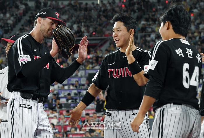 LG 톨허스트가 12일 수원 KT위즈파크에서 열린 2025 KBO리그 KT와의 경기 7회말 수비를 무실점으로 마치고 더그아웃으로 들어가면서 동료들과 하이파이브를 하고 있다. 데뷔전을 치른 톨허스트는 7이닝 동안 77개의 공을 던져 2피안타 무실점의 호투를 펼쳤다. 2025. 8. 12.